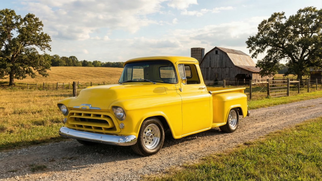 1957 Chevrolet 3100 Restomod blends classic pickup styling with updated performance and drivability. Finished in a bright yellow exterior with a black interior, the truck highlights the recognizable design of the 1957 Chevrolet pickups while presenting a clean and bold appearance.