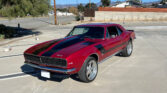The exterior is finished in Bright Cherry Red with a small flake metallic base/clear coat. It is complemented by black accent hash stripes and custom graphics painted under clear. The body lines are straight, with even gaps on the doors, hood, and trunk, all of which open and close properly. The car is rust-free, with solid original floor pans. Chrome bumpers, emblems, and trim are in 9 out of 10 condition. The trunk is clean and rust-free, retaining the original spare tire and an amplifier. It rides on polished 18-inch Eagle alloy wheels with 2018 Firehawk tires.